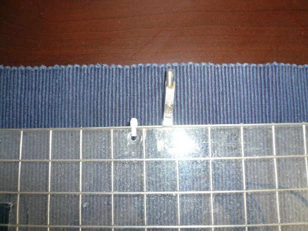 Jetzt werden an der langen Ober- und Unterkante des Gitters jeweils zwei bis drei Karabiner gleichmäßig verteilt. Dies vermeidet das extreme Durchbiegen des Gitters, wenn es später an der Decke hängt. Nun kannst Du im Voliereninneren eine Seite der Gitterfläche oberhalb der Vorderkante der Holzplatte einhängen. Ich habe die Folienseite als Innenwand des Inhalierkäfigs gewählt, damit an der herunterhängenden Inhalierkäfigtür nicht auf und ab geklettert werden kann. Fertig ist der Inhalierkäfig